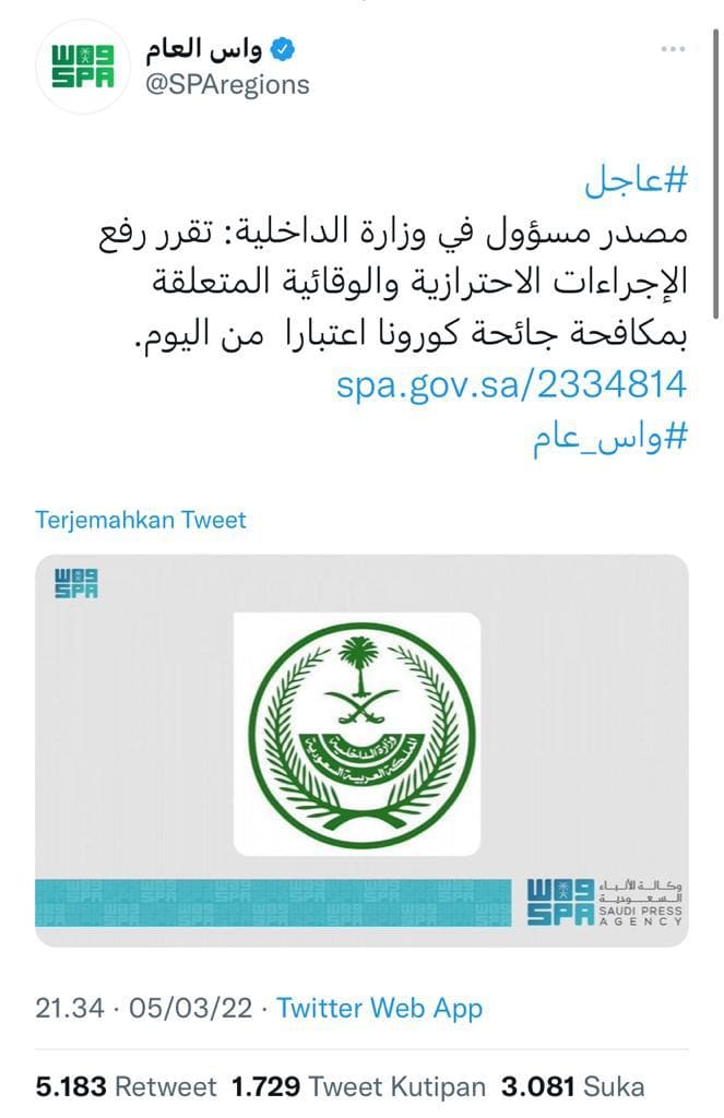 Pencabutan kebijakan tersebut dirilis langsung oleh Kementerian Dalam Negeri Saudi yang menegaskan aturan jarak sosial dan mengenakan masker di luar ruangan tidak lagi wajib di Arab Saudi.