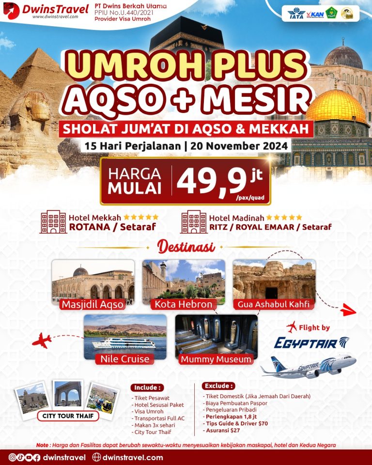 Travel Sunnah Dwins Travel menyediakan paket umroh Plus Aqsa dan Mesir dibulan November ini dengan harga yang terjangkau dan fasilitas tentunya melimpah.