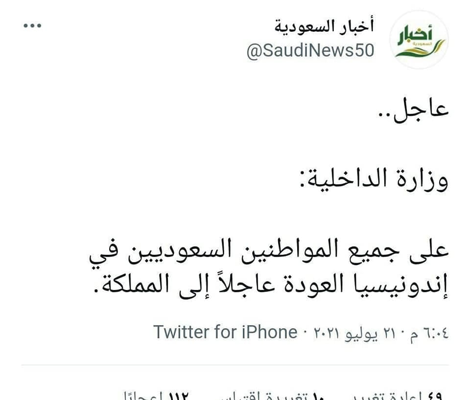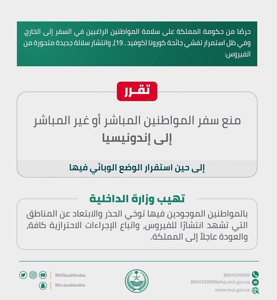 Berbagai media resmi pemerintah maupun media umum Rabu 21 Juli 2021 memberitakan tentang larangan warga Saudi untuk bepergian secara langsung ataupun tidak langsung ke Indonesia, dan bagi warga Saudi yang masih berada di Indonesia untuk secepatnya kembali.