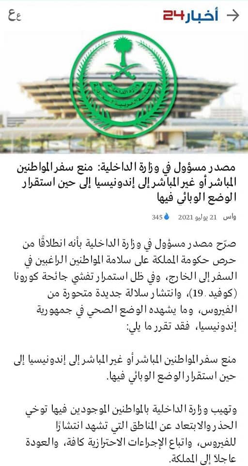 Berbagai media resmi pemerintah maupun media umum Rabu 21 Juli 2021 memberitakan tentang larangan warga Saudi untuk bepergian secara langsung ataupun tidak langsung ke Indonesia, dan bagi warga Saudi yang masih berada di Indonesia untuk secepatnya kembali.
